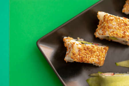 Top down close up view of sushi rolls with sesame seeds and cucumber on a black square plate. Flat on a bright green and light green background