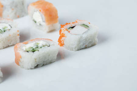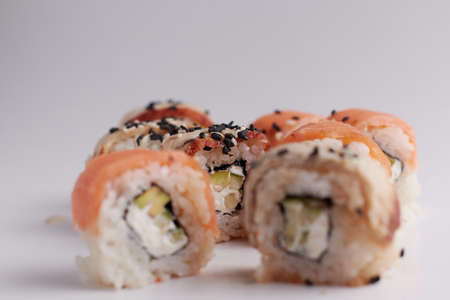 Sushi rolls with salmon, avocado, cucumber and cream cheese on white background