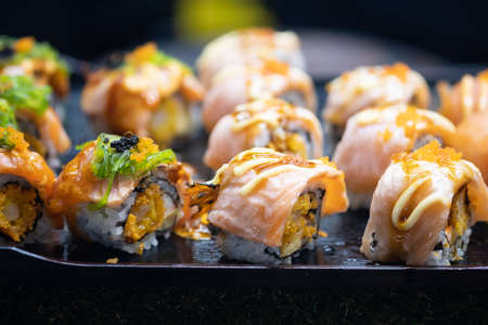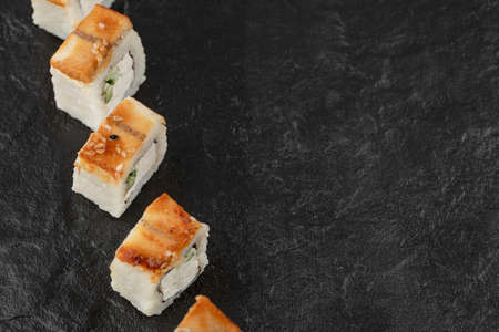 Close-up of delicious rolls laid out on textured black dishes. Top view, flat lay. Japanese cuisine