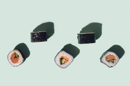 Vegetarian flat lay sushi concept. Many sushi with salmon, squid, tuna fish, rice, cucumber carrots and nori seaweed rolls on pastel green background.
