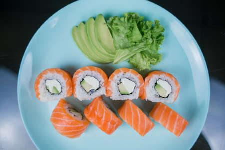 Large set of Delicious sushi rolls view from above Flat Lay . A lot assortment Philadelphia roll Dishes from Japanese raw fish in one plate in traditional restaurant. Japan food menu service