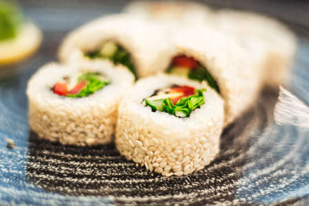 Partially blurred vegan sushi with pepper, lettuce, sesame seeds, cucumber
