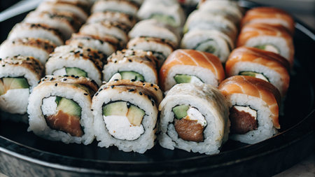 Close-up of delicious philadelphia uramaki sushi rolls with fresh salmon, cream cheese, avocado, and parsley, elegantly arranged on a sleek black plate