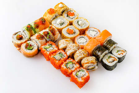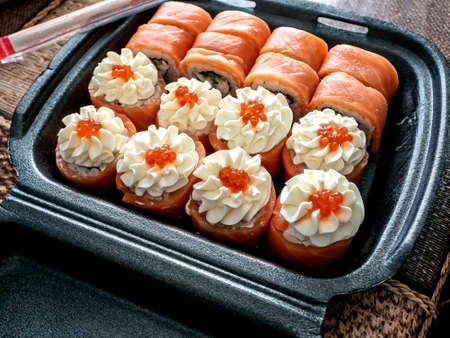 Japanese cuisine: rolls in a plastic container. Sushi on white background. Advertising concept of traditional Oriental cuisine, fish food: salmon, tuna, rice