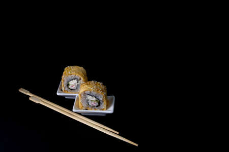 Japanese cuisine, rice rolls with crab meat on sticks on a black background.