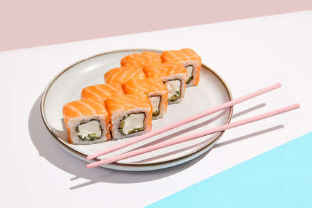 Popular sushi roll - philadelphia with salmon and cream cheese. Philadelphia maki in ceramic plate on colored backdrop. Sushi menu concept. modern japanese food. Maki sushi in minimal style.