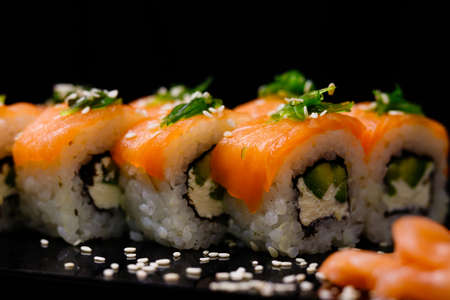 Traditional delicious fresh sushi roll set on a black background with reflection. Sushi roll with rice, red fish, salmon. Sushi menu. Japanese kitchen, restaurant. Seafood, asian food