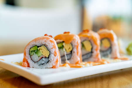 Sushi roll with salmon, avocado, cucumber, cream cheese and cream cheese.