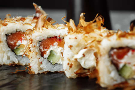 sushi rolls with cream cheese, fried salmon, tuna shavings or dried bonito, cucumber, nori. Chopsticks holding fresh katsuobushi roll in Japanese restaurant closeup