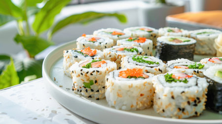 A plate of sushi rolls on a table with a plant in the background, showing various ingredients and types of sushi