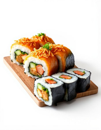 Delight in these beautifully presented sushi rolls topped with fresh herbs and crunchy garnishes, perfect for any culinary occasion or dining experience.