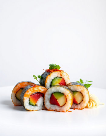 A close-up of delicious sushi rolls featuring vibrant colors and fresh ingredients. Perfect for showcasing Asian cuisine in food-related contexts.