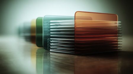 Stacked transparent sheets in various colors are arranged on a reflective surface, emphasizing a modern and minimalist aesthetic in a well-lit environment.