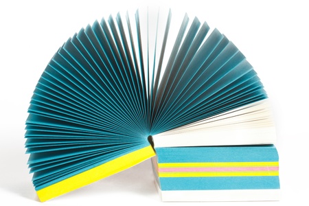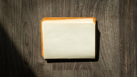 Notepad on a wooden table high angle view. Open notepad with blank paper. Copy space for text. Selective focus included