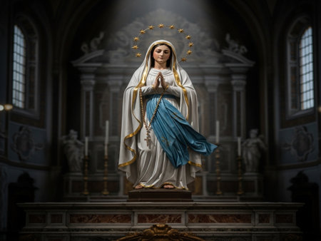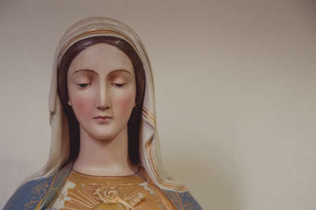 The Virgin Mary statue as a symbol of love and kindness in the catholic church interior. Bottom view. Religious architecture. Retro photo filter