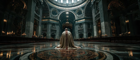 A person in white robes kneels in a grand cathedral surrounded by intricate architecture and soft light filtering through high windows.