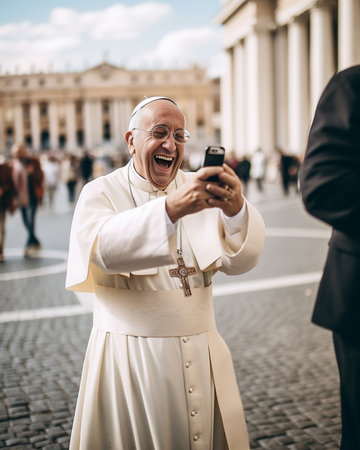 Generative AI : Happy handsome caucasian man take a selfie portrait in front of St Peters cathedral at Vatican City Rome Italy