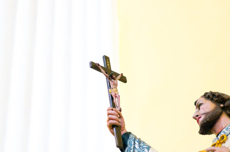 Lisbon, Portugal - October 24, 2016: Jesus Christ statue holding Cross or Crucifix and Sacred Heart on chest. Santo Antonio de Lisboa Church. Saint Anthony of Lisbon (Padua or Padova) church