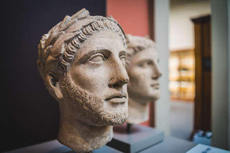 Woman's Head with Roman Emperor Busts Behind at the Istanbul Archaeological Museum in Istanbul, Turkey.