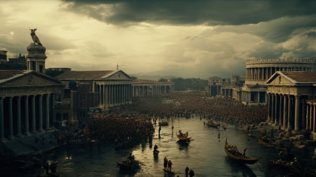 Julius Caesars triumphant return to Rome highlighting the city's stunning architecture and the grandeur of the Roman Empire. Concept Roman Empire, Julius Caesar, Grand Architecture, Triumphal Return
