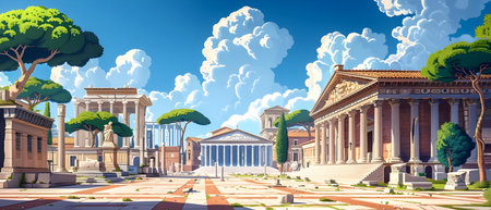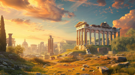 Fiction scenic view of Ancient Rome in summer, landscape of old ruins at sunset. Scenery of historical buildings, sun and sky. Concept of Roman Empire, painting, antique, travel, background. Generative AI