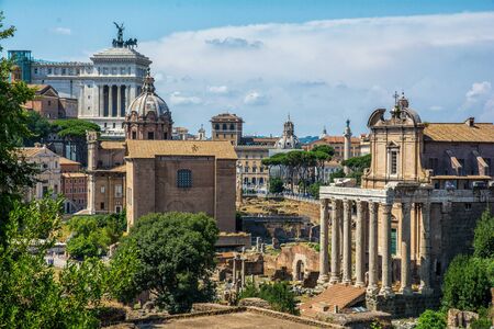 ROME, ITALY - JUNE 24, 2017: Panorama of ruins of Roman Forum in city of Rome, Italy