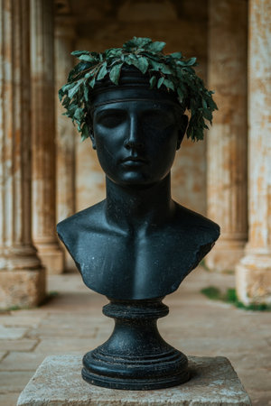 Close-up of a majestic Roman emperor statue, showcasing intricate detail and conveying power and legacy. Ancient history embodied in stone.