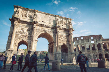 Rome, Italy - October 2019: The Arch of Constantine, a triumphal arch in Rome, situated between the Colosseum and the Palatine Hill in Colosseum archaeological park in Rome, Italy
