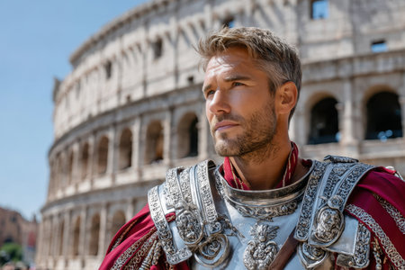 A man dressed as a Roman soldier stands confidently at the Colosseum, showcasing historical attire on a bright day.