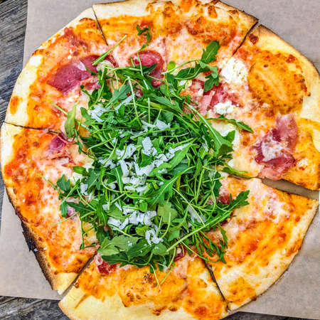 close-up of delicious pizza with arugula. top view of a detail of the pizza