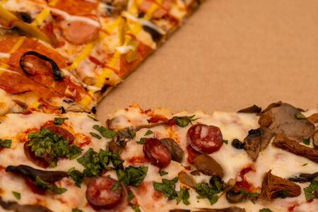 Delicious slices of fresh hot crispy pizza with golden crust. Melt in your mouth mozzarella cheese, slices of salami, pepperoni, bacon and mushrooms. close up.