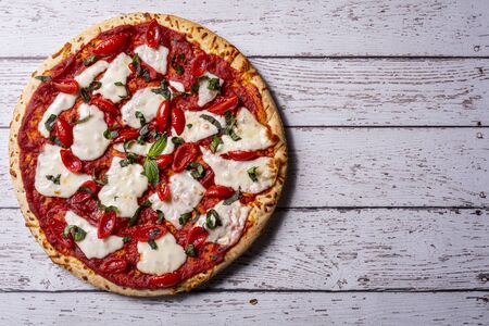 Fresh Homemade Italian Pizza Margherita with buffalo mozzarella and basil .very tasty looking pizza with cheese . Restaurants or pizzerias, template with delicious taste pepperoni