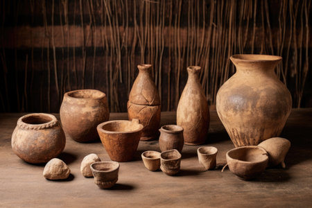neolithic pottery pieces arranged on a wooden surface, created with generative ai