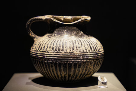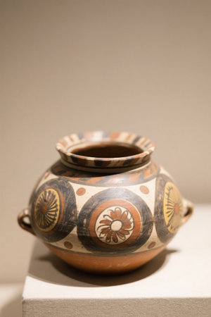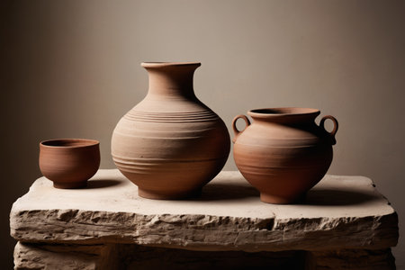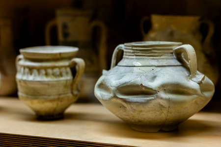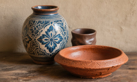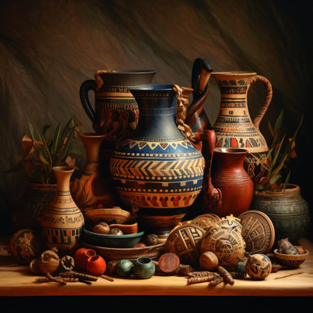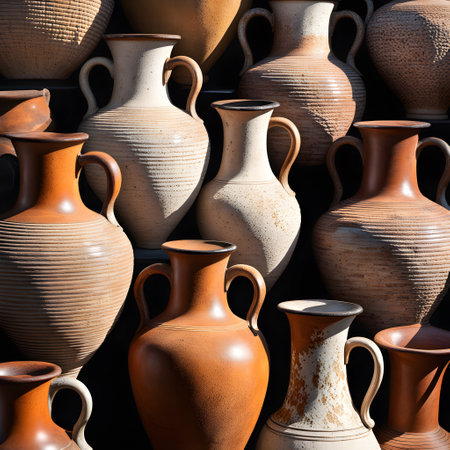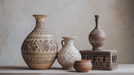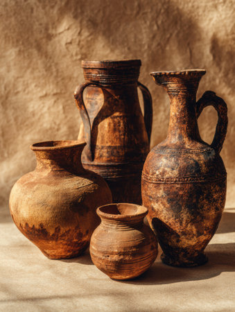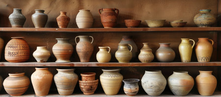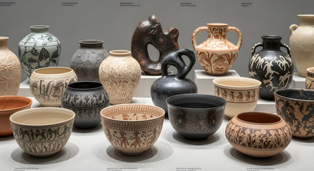 A beautiful arrangement of ancient pottery artifacts showcasing unique designs and craftsmanship. Ideal for cultural and historical themes in art.