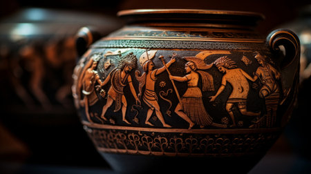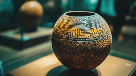 This captivating image showcases an ancient ceramic pot featuring intricate patterns and rich textures. Ideal for culture and art themes.