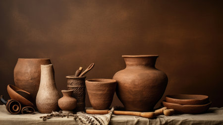 Brown clay pottery and tools arranged on a neutral surface with warm lighting and shadows.