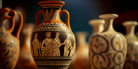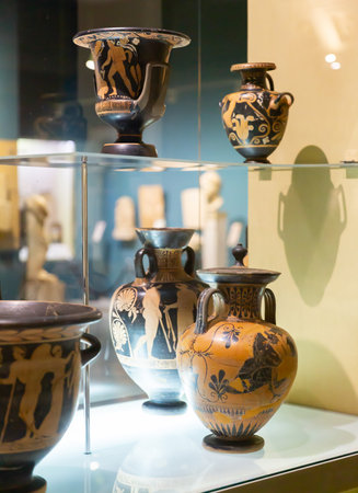 Collection of ancient greek pottery, featuring intricate designs and patterns, carefully arranged on display in a museum