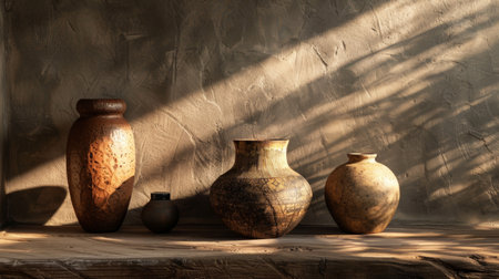An artistic display of rustic pottery with dramatic shadows falling on a textured wooden background under warm light.