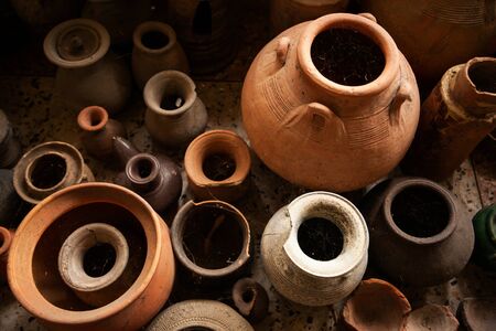 Top view shot of a group of ancient pottery vessel are display at the local museum of Sing Buri, Thailand. The museum is open to the public.