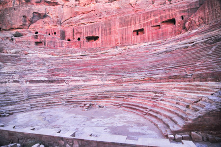 Roman-era amphitheater carved into the pink sandstone at Petra, Jordan. The building facades cut into the rock behind are ancient graves.