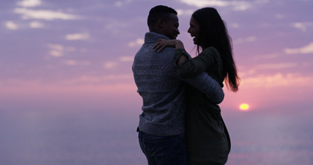 Romantic Silhouette of an Interracial Couple Kissing Against Warm Light Backdrop Creating Emotional Connection and Love. Valentine's Day.