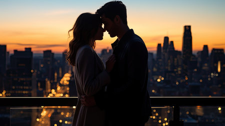 Silhouette of a loving couple looking at the city at sunset