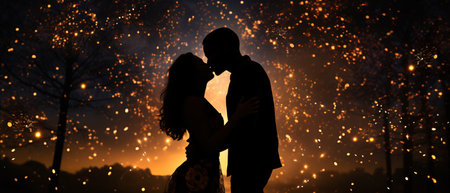 A young couple shares a romantic kiss at night, silhouetted against a backdrop of city lights and fireworks. This image evokes feelings of love and celebration. Ideal for Valentine's Day.
