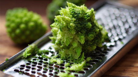Fresh broccoli is being finely grated on a stainless steel grater while other broccoli pieces rest nearby. This scene takes place in a bright kitchen, showcasing healthy food preparation.