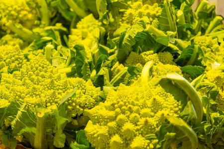 Green romanesco background. Bulk natural romanesco texture. Bunch of organic and ecological cabbages. Vegetables and vegetables background. Sustainable and healthy food.