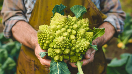 farmer holding a green romanesco broccoli and brussels sprouts generative ai