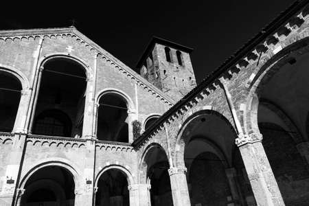 Milan (Lombardy, Italy): the medieval church of Sant'Ambrogio, in Romanesque style. Facade and portico. Black and white