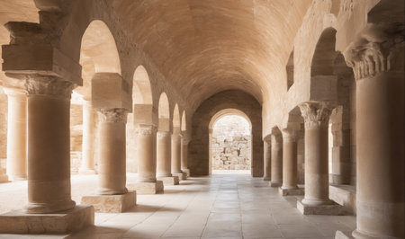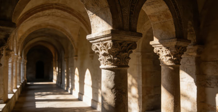 Timeless architecture featuring five tall stone columns, soft daylight highlighting carved details, set against neutral background
