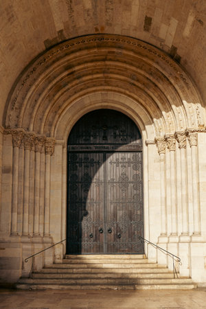 Beautiful Romanesque church entrance in Lisbon, Portugal, featuring intricate stone arches and a grand wooden door, ideal for architecture, travel, and heritage concepts.