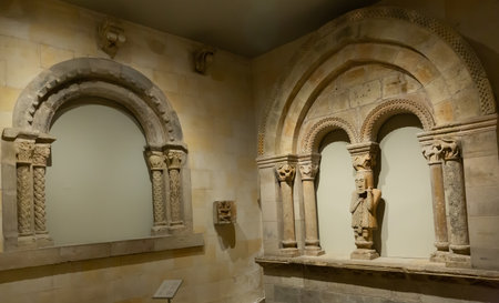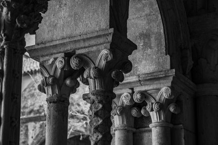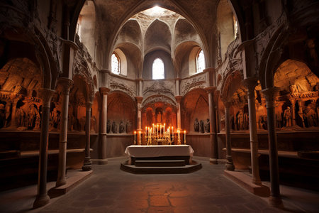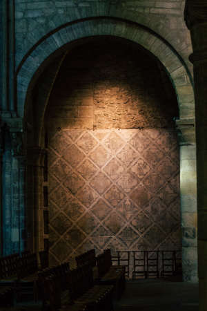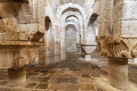 Leyre, Spain - August 10, 2019 : Interior of the ancient romanesque crypt of the Church of Holy Savior of Leyre Iglesia de San Salvador de Leyre , Navarre , Spain.